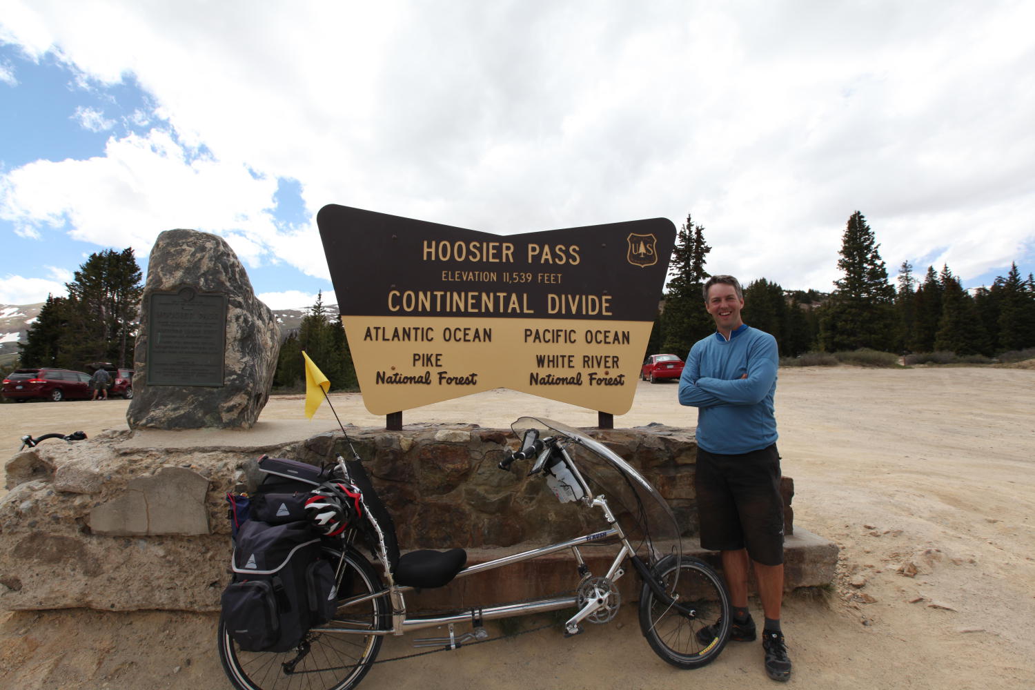 “Woohoo!”, I yelled as I crested the continental divide. A guy milling about at the top replied with a hearty, “Right On, Man!” and handed me a Pabst Blue Ribbon. Another PBR was on offer for the Brits as they rolled up just a minute behind me. We fooled around for about 20 minutes drinking our delightfully refreshing beverages and taking every possible permutation of picture with the sign.