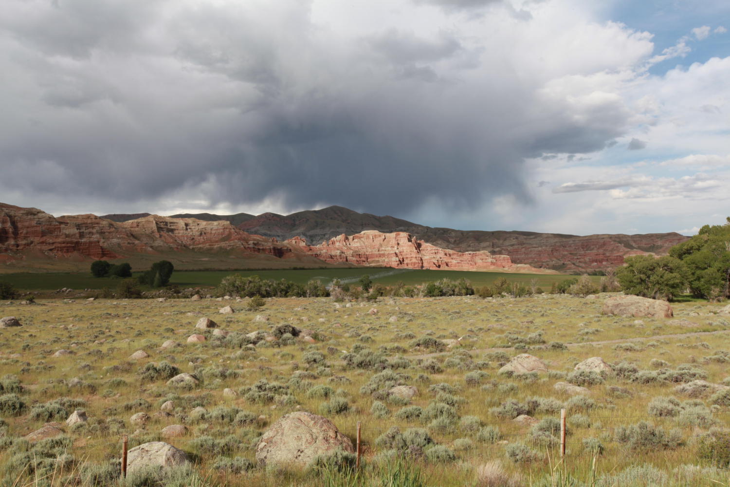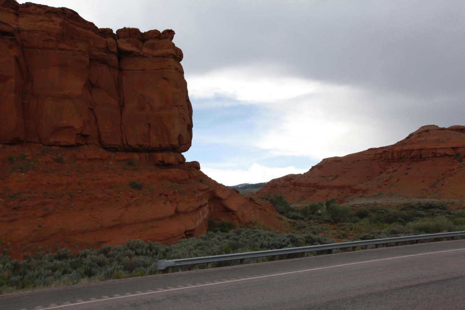 Immediately in front of me, the rushing Wind River crashes against striking red rock structures. The rocks are thin at the base, getting wider as they thrust several hundred feet into the sky. Atop all of this grandeur and beauty, anvil shape thunder clouds alternate with striking blue skies. The sun will sometimes pierce the edge of a cloud and shine down in brilliant stabs of light illuminating one feature for a few seconds and then another just a minute later. The light draws the eyes to new features every few seconds and some new beauty emerges.