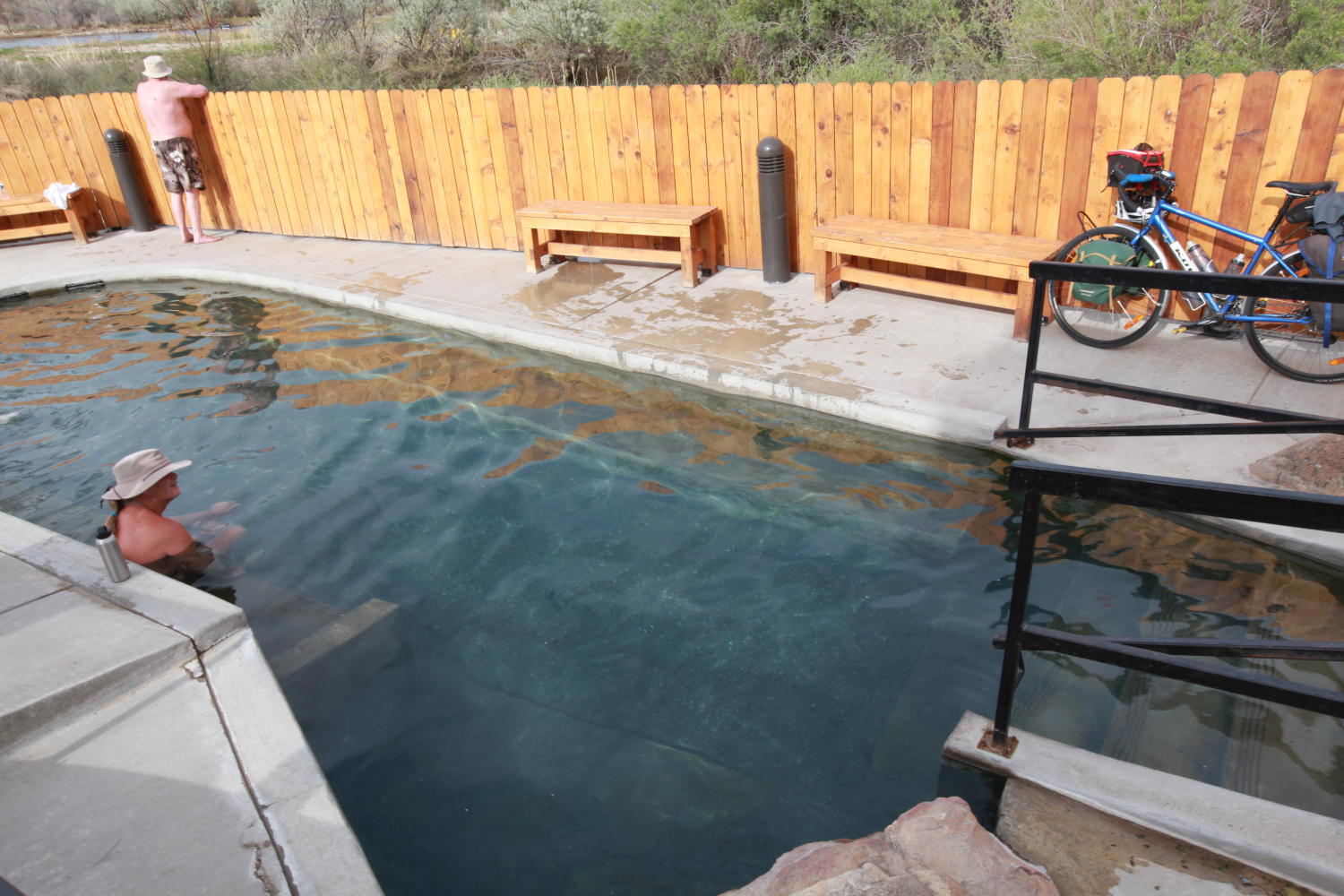Today’s ride was as representative of the trail as a single day could be. Ups and downs, but more ups than downs. The ups are mostly things I’ve seen before: beautiful views, good conversation, hot springs, mostly downhill. I’ve crossed another state line.